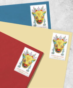 The stamp features a colorful. three-dimensional mask depicting a dragon. Created out of paper. then cut. scored. and folded into shape. the mask is a contemporary take on the long tradition of paper-cut folk-art crafts created during this time of year. The dragon is embellished with acrylic paint and other paper elements. like flowers and tassels. Gold and red are the predominant colors ?a gold signifying prosperity in the coming year. and red representing good fortune.